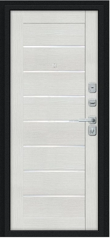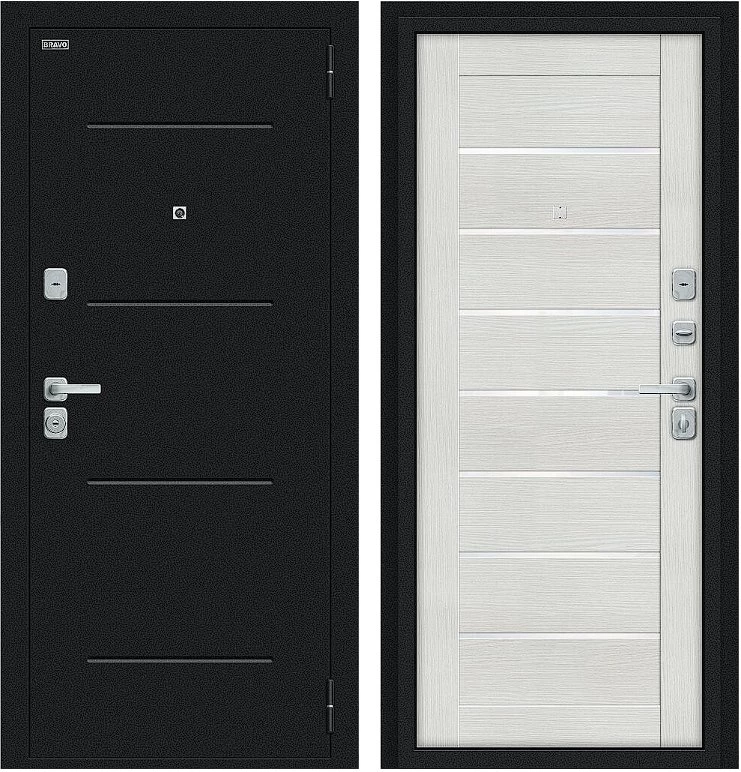 Надежная входная Дверь Браво Техно/BChrome Букле черное/Bianco Melinga премиум класса по цене 34 843 руб. Большая толщина стали защитит от проникновения в ваш дом, квартиру или коттедж. Используется очень качественная фурнитура: замки, цилиндры, ручки, защелки. Покрытие и отделка двери изготовлено под внимательным контролем производителя. Дверь имеет долгий срок службы и гарантию.